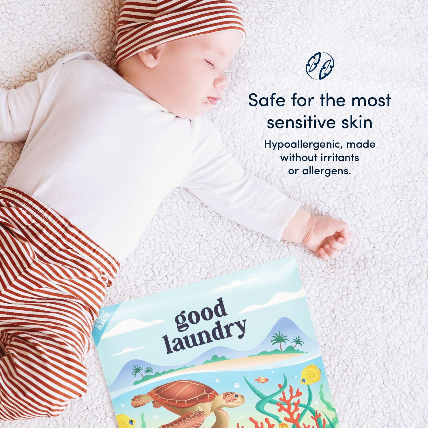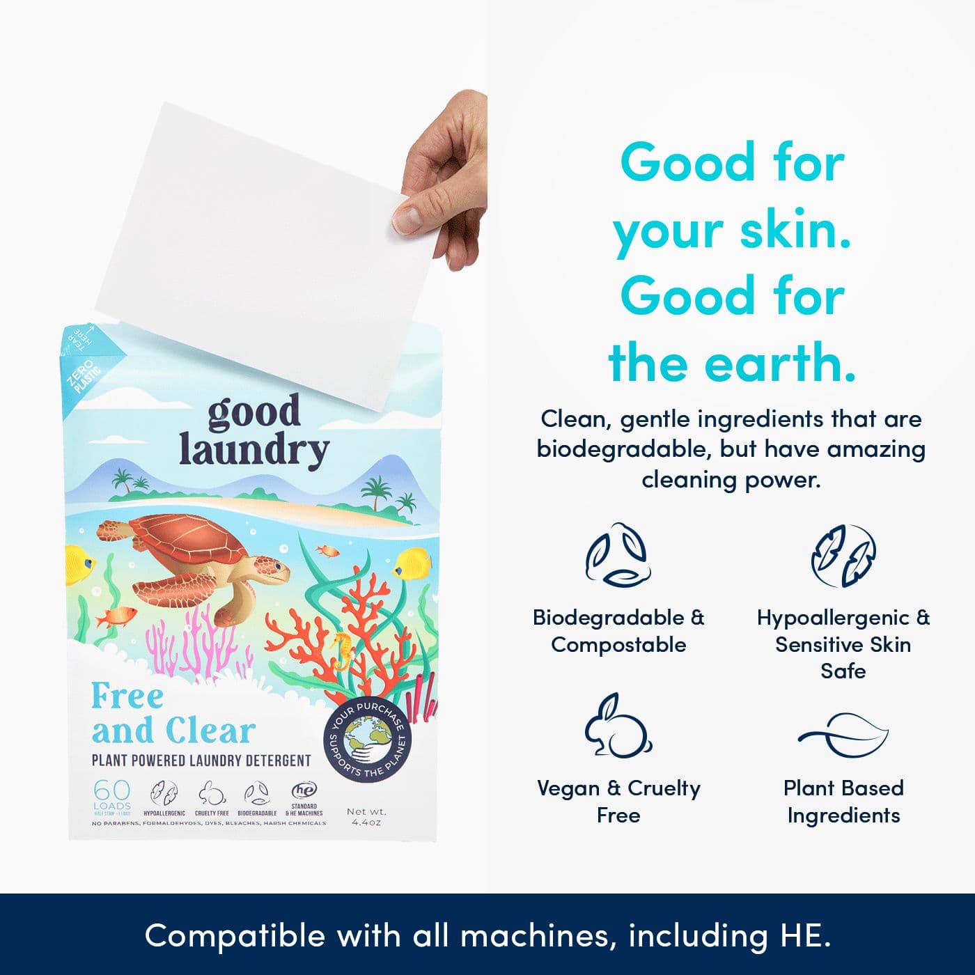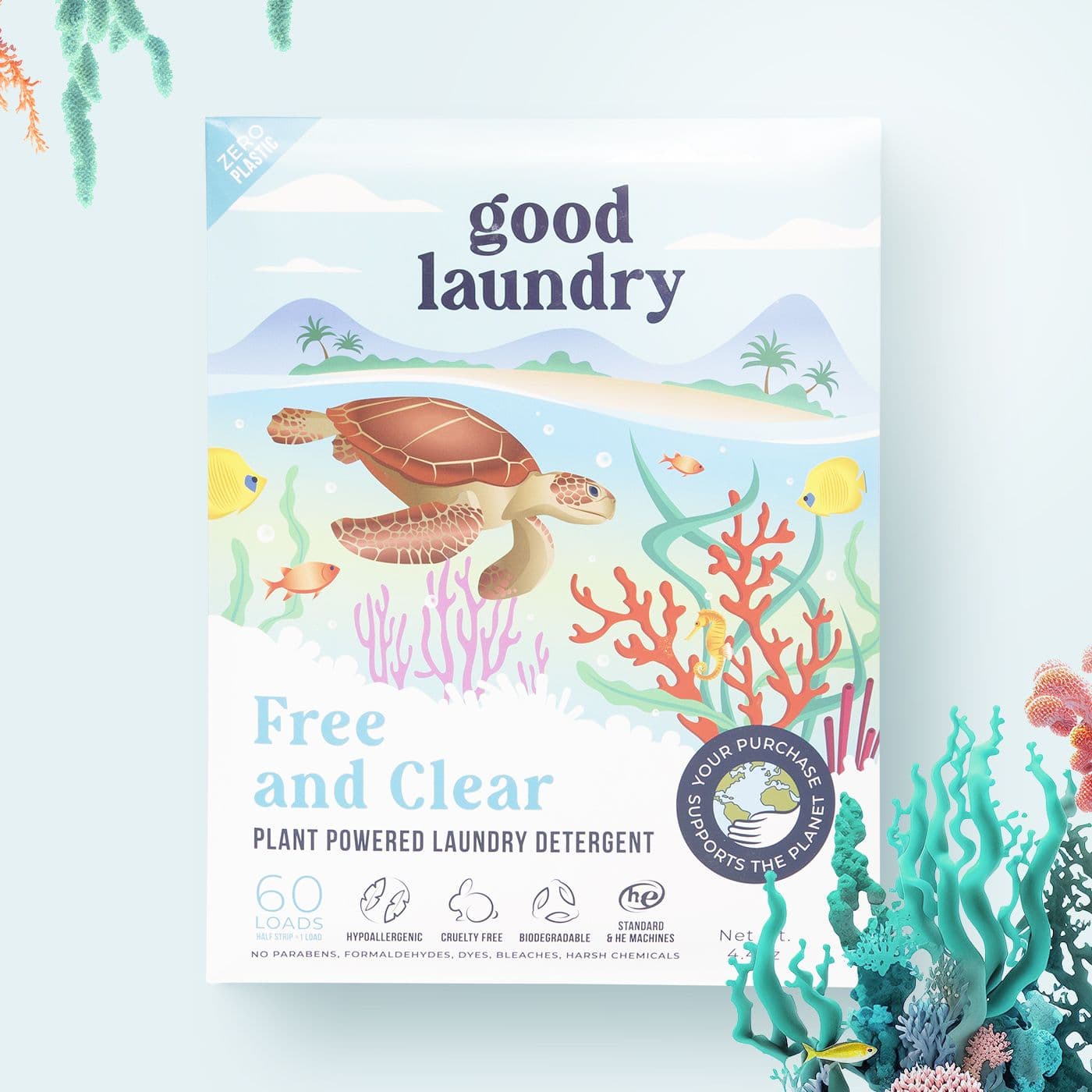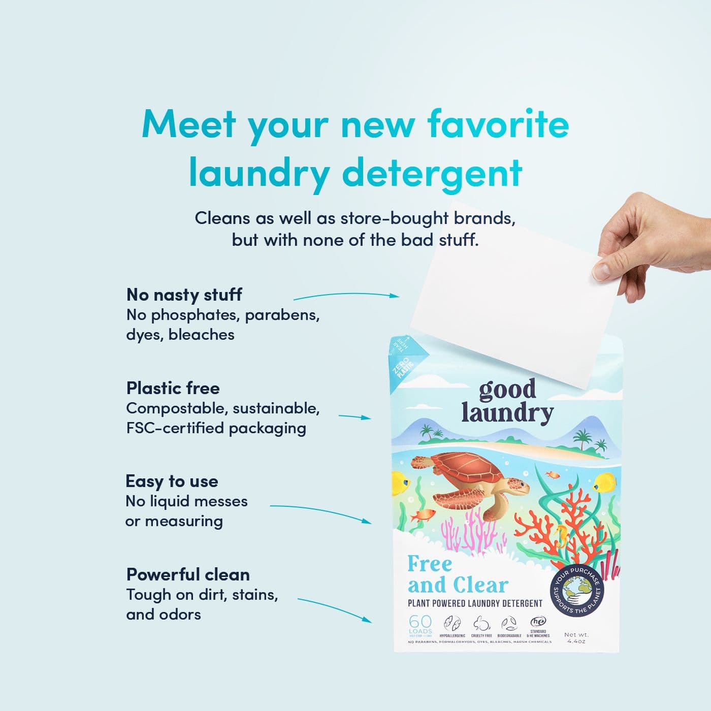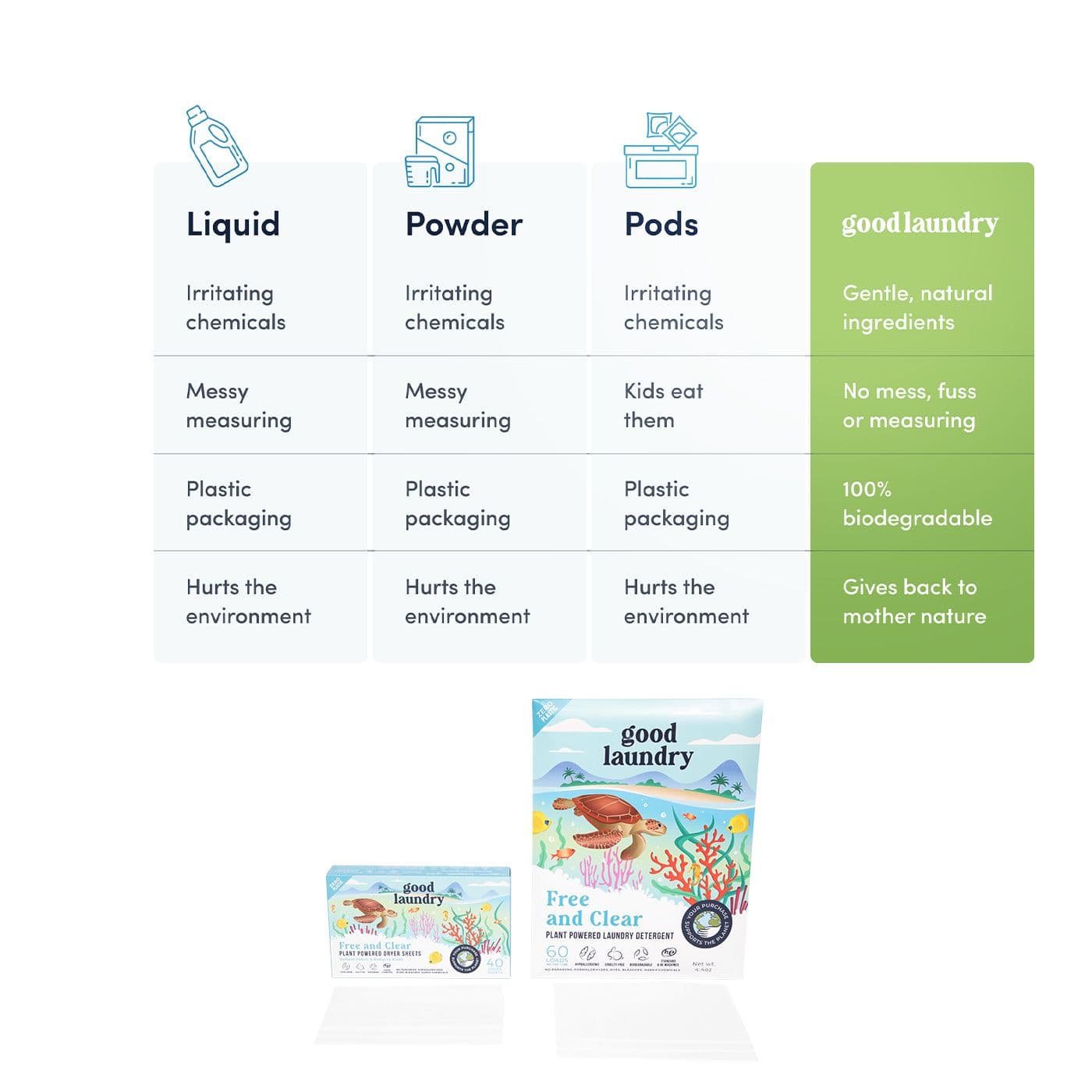 Other detergents contain harsh chemicals that irritate the skin, and plastic packaging that harm the environment. Good Laundry products are made to have the same cleaning power, but are gentle on the skin and made with clean ingredients.