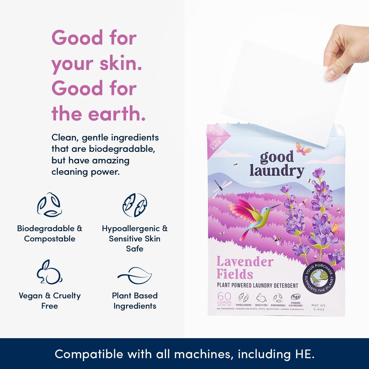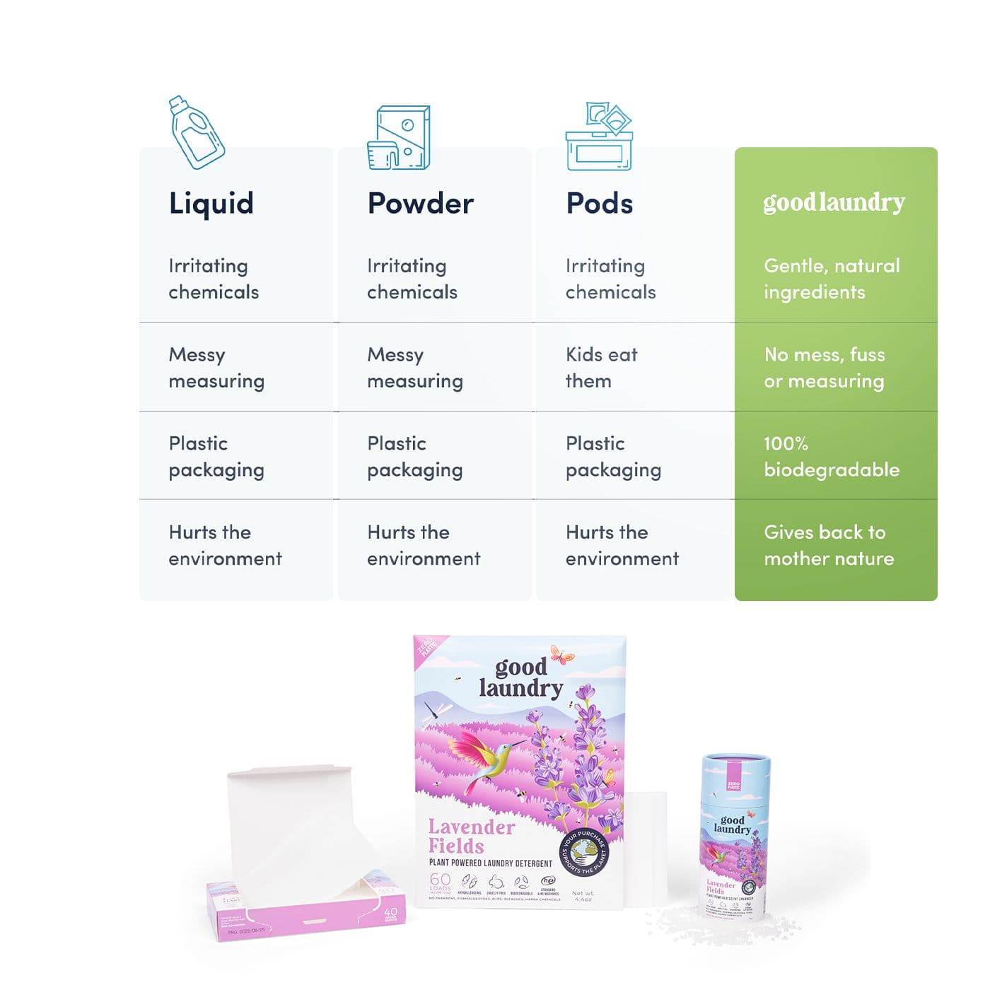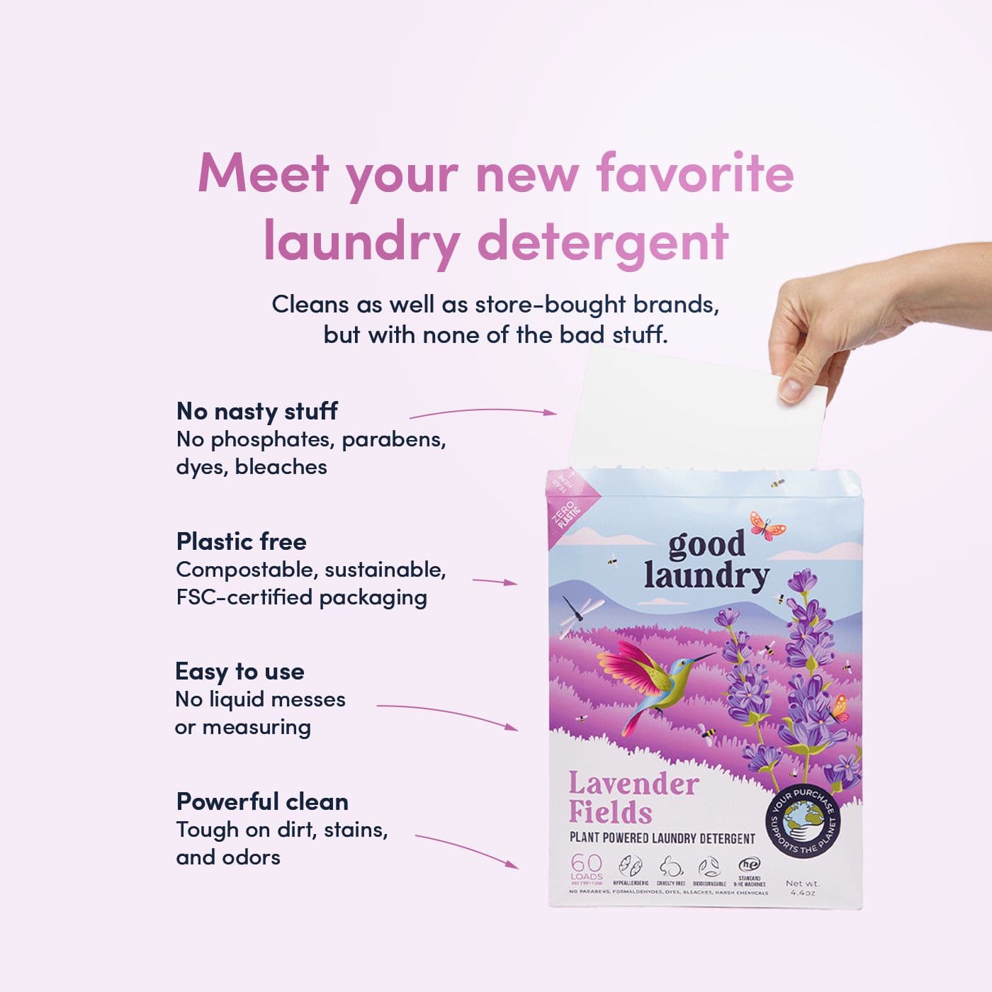 Other detergents contain harsh chemicals that irritate the skin, and plastic packaging that harm the environment. Good Laundry products are made to have the same cleaning power, but are gentle on the skin and made with clean ingredients.