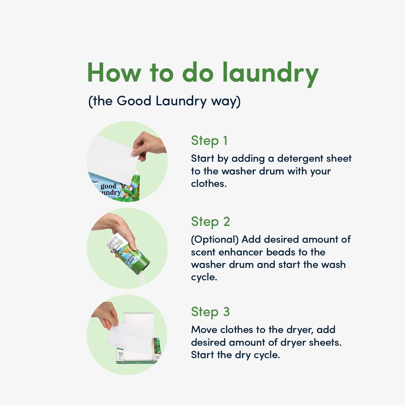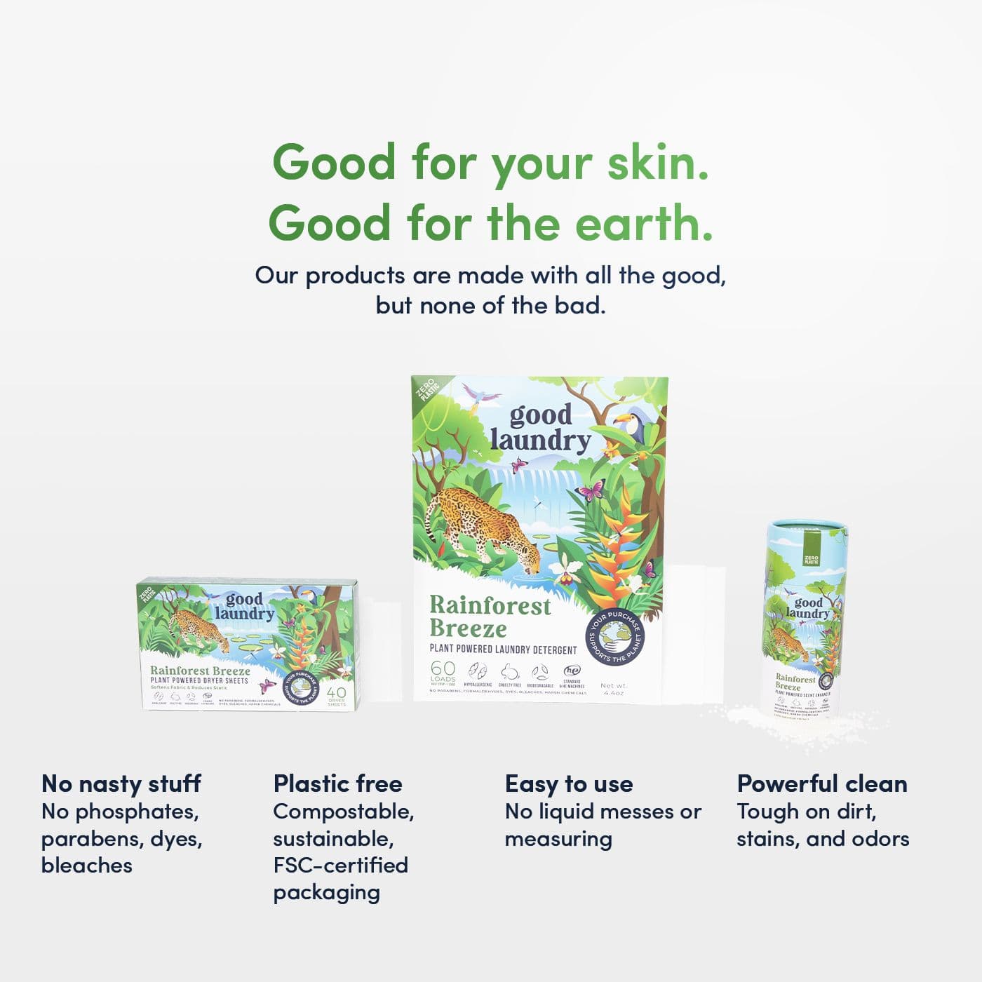 Other detergents contain harsh chemicals that irritate the skin, and plastic packaging that harm the environment. Good Laundry products are made to have the same cleaning power, but are gentle on the skin and made with clean ingredients.