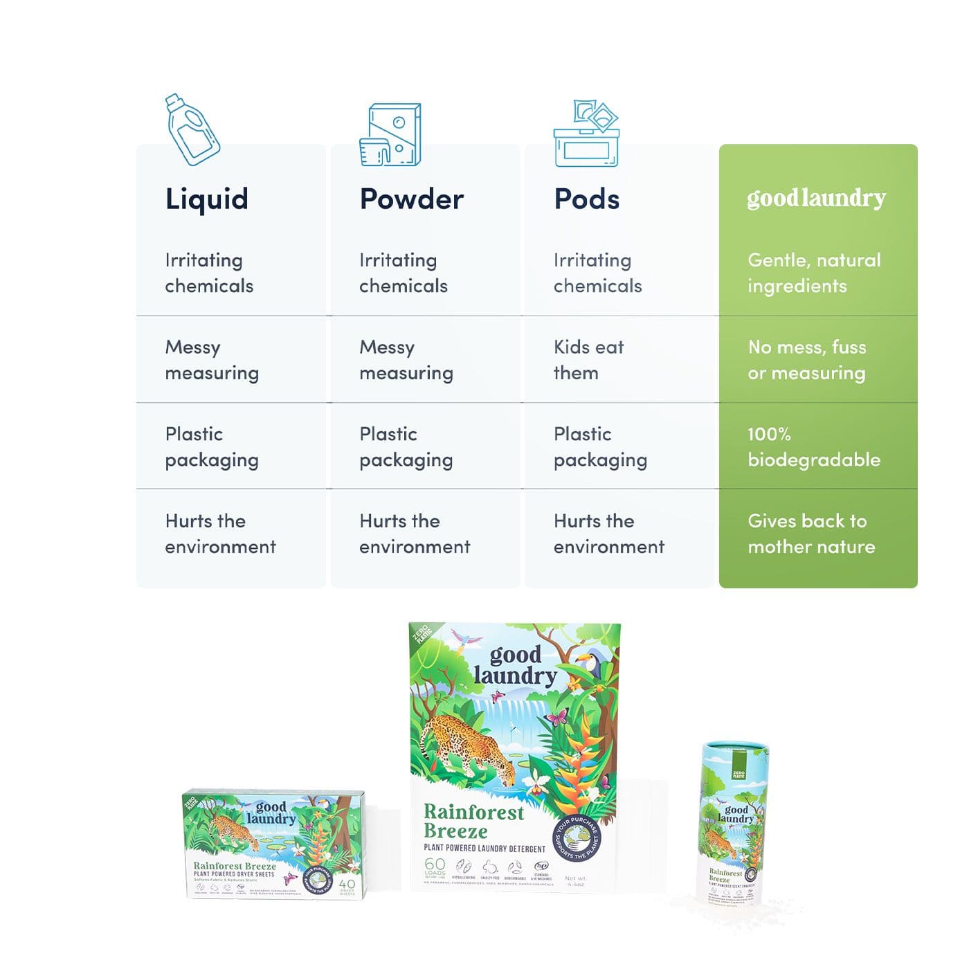 Other detergents contain harsh chemicals that irritate the skin, and plastic packaging that harm the environment. Good Laundry products are made to have the same cleaning power, but are gentle on the skin and made with clean ingredients.
