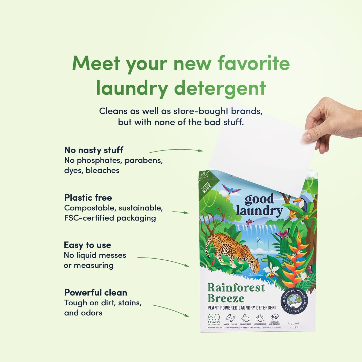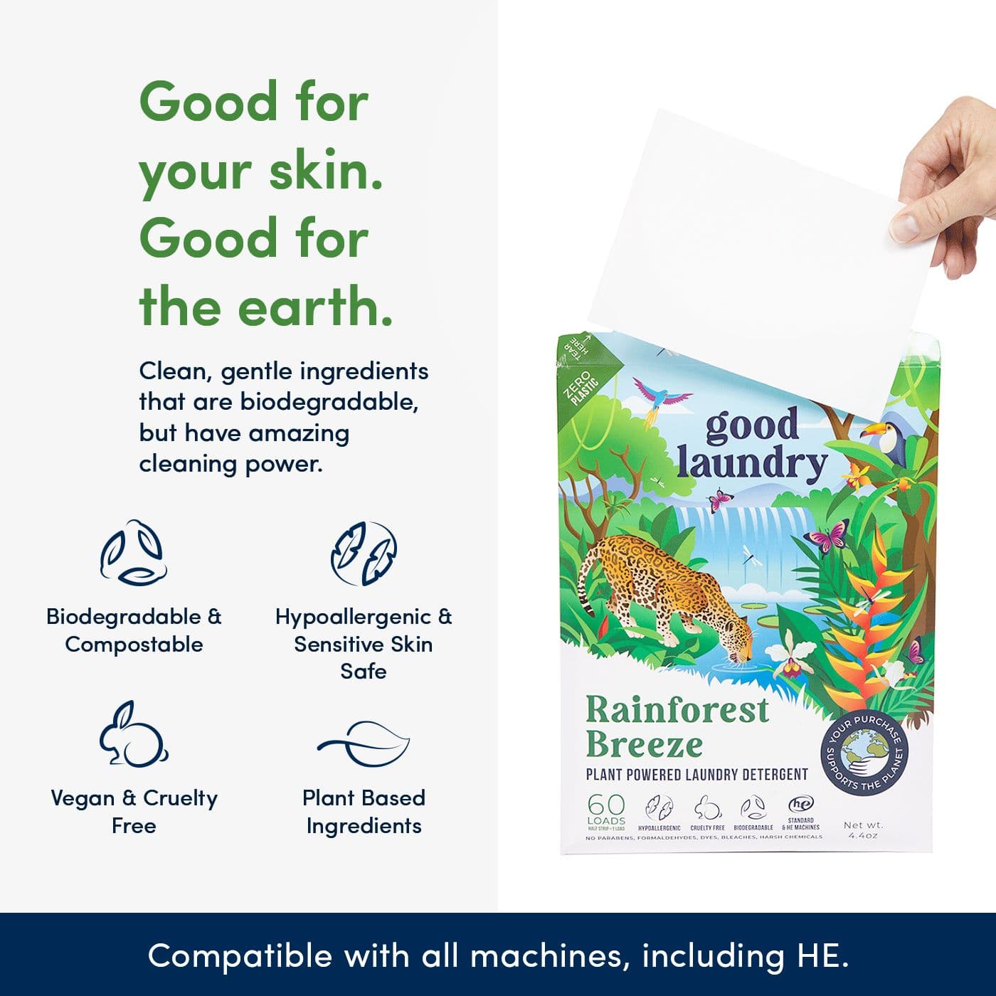 Other detergents contain harsh chemicals that irritate the skin, and plastic packaging that harm the environment. Good Laundry products are made to have the same cleaning power, but are gentle on the skin and made with clean ingredients.